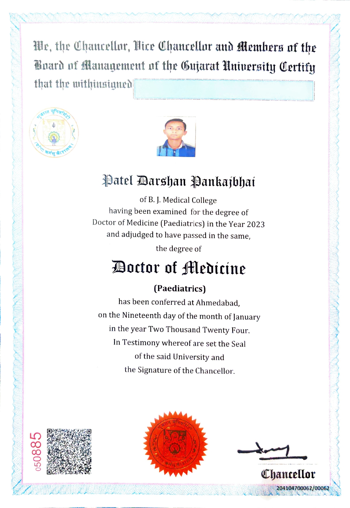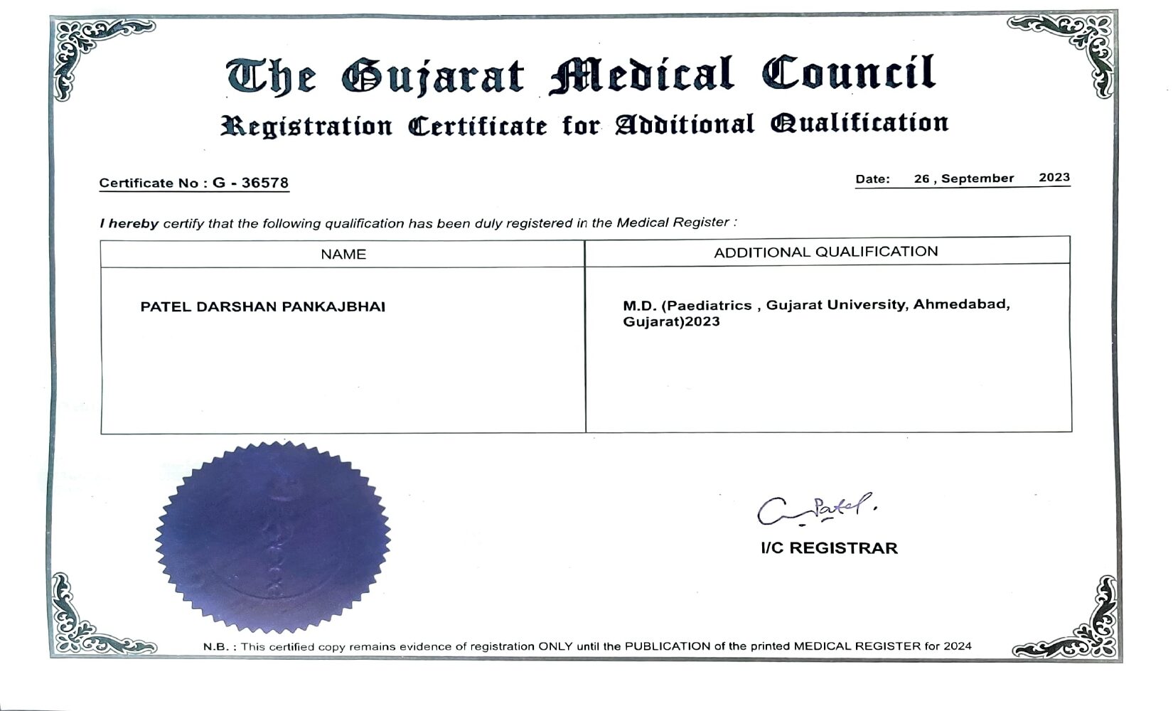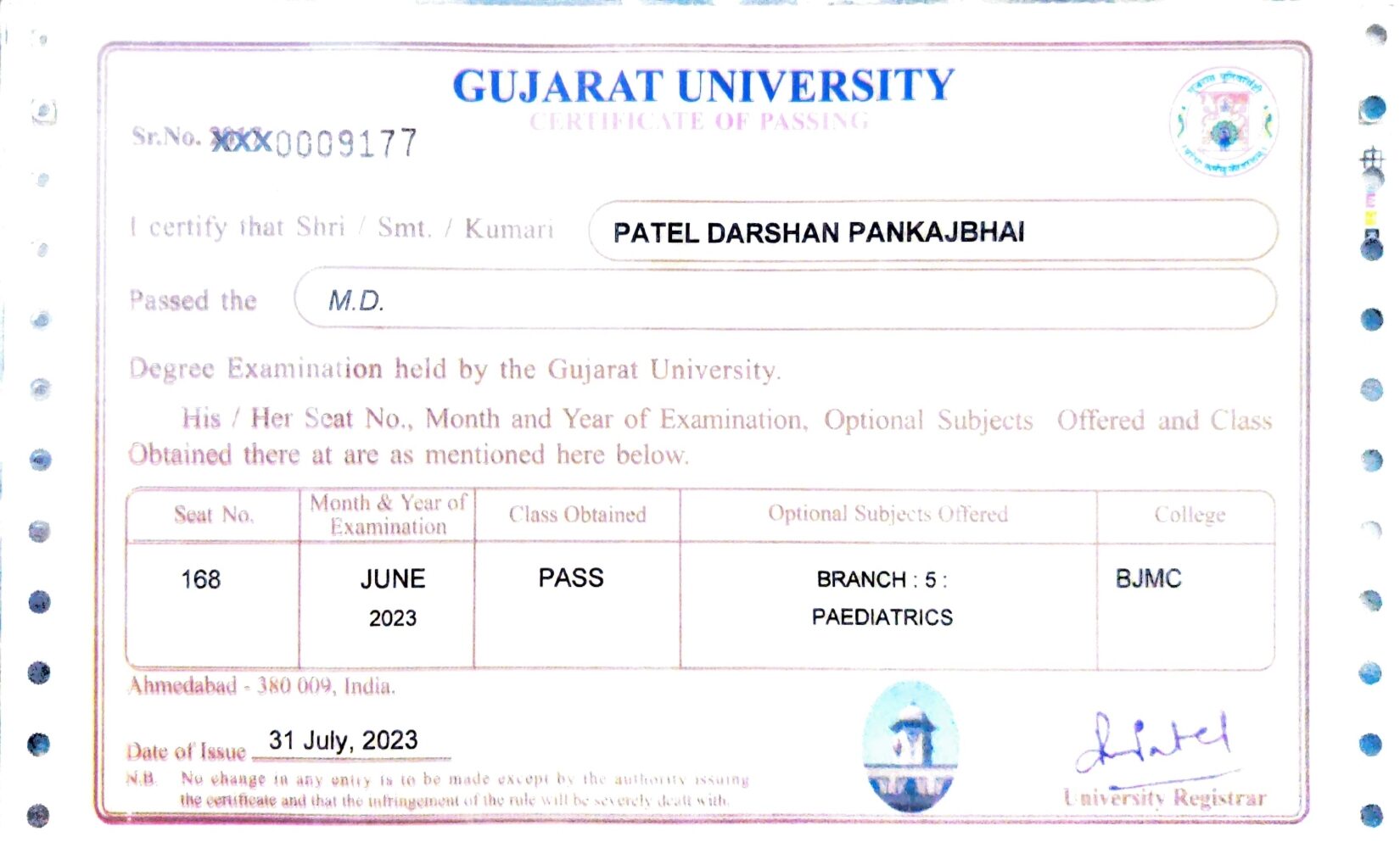 Dr Darshan P. Patel completed his MD in Pediatrics from BJ Medical College, Civil Hospital, Ahmedabad, after earning his MBBS from Civil Hospital, Sola.